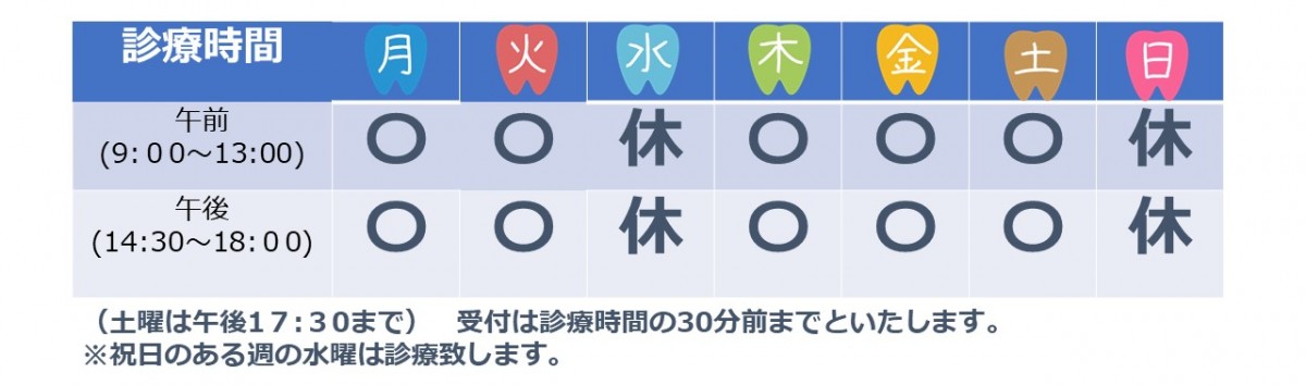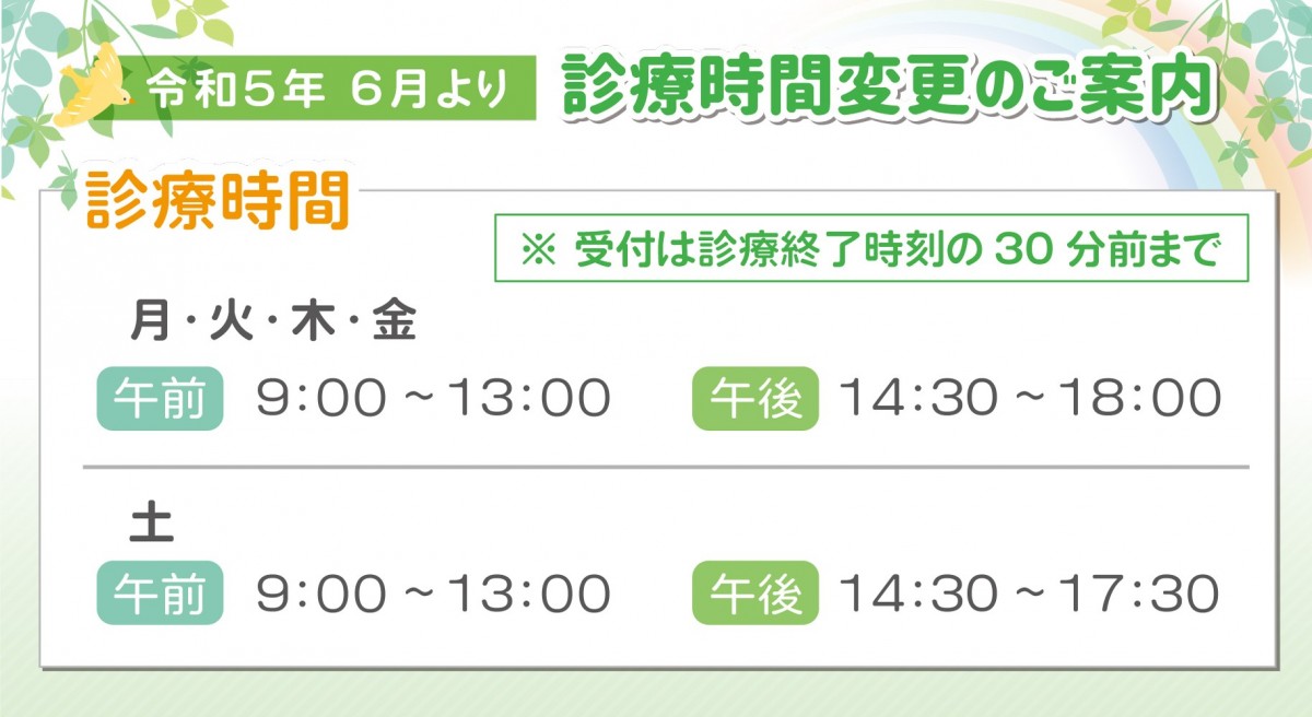 診療時間 | 月・火・木・金・土 9:30~13:00 14:30~18:30 (土曜は18:00まで) ≪休診日≫水曜・日曜・祝日 ※祝日のある週の水曜は診療致します。 学会など臨時休診をいただく場合があります。 詳しくはお問い合わせください。 |